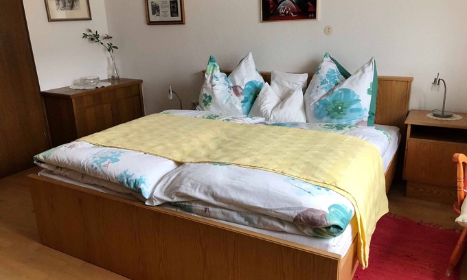 Family-run house with a pleasant living atmosphere, centrally located. 1 holiday apartment, 2 double rooms with shower / WC, cozy lounge1 Apartment for max. 4 persons, 2 double rooms with shower / WC, satellite TV lounge, terrace, rich breakfast garden with natural pond and lawn, children's playground, table tennis, sauna, barbecue, bike rental. Packages for child reduction. Heating surcharge according to consumption.
