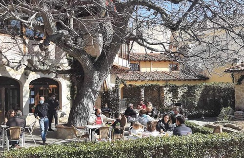 outdoor summer dining room in the shade of a bicentennial walnut tree.