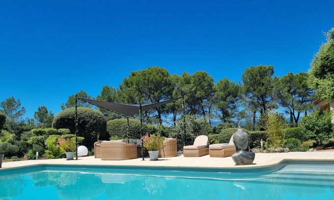 Discover Provence in the spring! T2 38 m2 in villa standing + pool house with fully equipped summer kitchen of 16 m2 available at the edge of the pool to fully enjoy the meals taken outside according to your desires, all on a closed ground of 4300 m2 furnished with taste and comfort, located on the plateau of Arcs / Argens, quiet and surrounded by nature. halfway of the Gorges du Verdon and the sea, 10 km from Draguignan, 27 km from Frejus, 43 km from St Tropez and 56 km from Cannes. Pool 5 x 10, petanque, rest in the sun with the song of cicadas.
