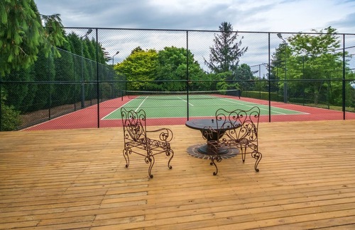 As you step inside, you'll find five spacious bedrooms and four well-appointed bathrooms, accommodating up to 10 guests comfortably. The generous open-plan kitchen and living area, complete with a cozy fireplace, invites celebration and laughter among family and friends. Enjoy outdoor entertaining on the expansive covered deck with barbecue facilities, or challenge your loved ones to a match on the private tennis court. For those seeking a unique twist, the property features a vintage theatrette and a striking Stonehenge replica, ensuring your wedding celebrations are as memorable as they are picturesque.