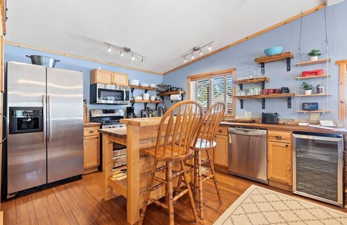 Inside the cabin, you'll find all the modern comforts you need to unwind after a day of outdoor adventure. Our two cozy bedrooms feature queen-sized beds, with one room boasting a sliding glass door that leads out to the backyard patio area. The cabin also features a full bathroom, a fully equipped open kitchen with an island and barstools, a breakfast nook for dining, and a comfortable living room with a gas stove, Smart TV, and DVD player with select movies.