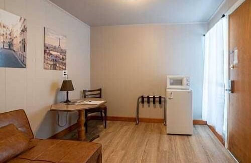 Large Room with 2 Queen beds, a small couch that rolls out to a twin bed, refrigerator, microwave and coffee machine. The bathroom is newly remodeled. This room is around the left side of motel. The floors in the bathroom and bedroom are Vinyl Floor Planking, light gray walls and art on the walls.