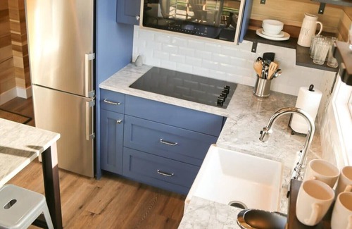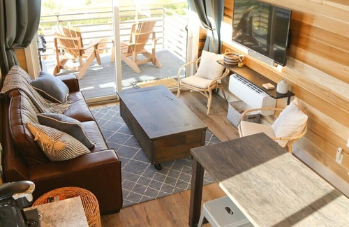 The kitchen and living room feature an open floor plan with a sliding glass door that opens to the deck, where you can sit and take in the incredible views. The living room has a queen-sized sofa sleeper, two lounging chairs, a hand-crafted coffee table with extra bedding storage, and large Smart TV. The kitchen is well stocked with kitchen essentials, beautiful stainless steel appliances, a convection microwave oven for cooking and baking, a stovetop, a large refrigerator, a Keurig coffee machine, granite countertops, farmhouse sink, dishwasher and a table/prep island with seating for four.
