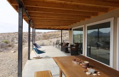 Star Lodge on Terlingua Ranch is a contemporary custom-built solar powered home that accommodates up to six guests. Situated on 80 private acres with stunning mountain views and breathtaking night skies. You will have privacy and room to enjoy your stay. Two bedrooms; one and one-half bathrooms; an open living, dining, and kitchen area; covered parking; expansive covered patios; and 80 private and pristine acres of Chihuahuan Desert wilderness. It is named “Star Lodge” because it is in one of the best places in the continental US for enjoying views of the star filled sky.
