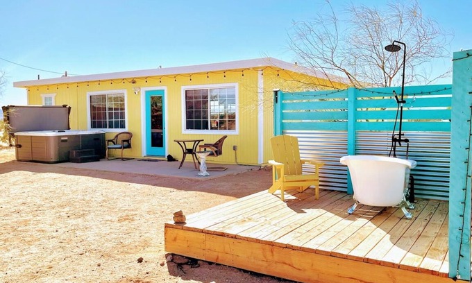 The Desert Daisy Haus is what desert dreams are made of! It’s a 10 min drive on a bumpy dirt road to get to this gem, giving you that true desert experience! It sits remotely in the middle of the desert surrounded by native plants & never ending skies! With a set of bunk beds, a queen bed, & futon it's perfect for a group of friends! The new kitchen, hanging hammock chairs, fire pit, & outdoor tub & shower are just a few reasons why this place is perfect for you to sit back, relax & star gaze!✨
