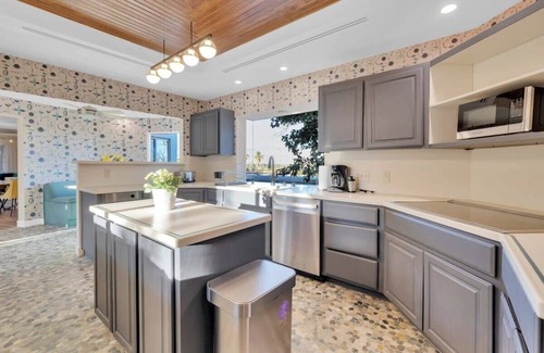 * The Kitchen: A fully equipped kitchen with an electric range, double oven, and an oversized refrigerator (with an extra fridge in the garage). The kitchen also features a microwave, a coffee maker, and a dishwasher. With sufficient pots, pans, cutlery, dishes, cups, serving platters, etc you'll have everything you need to serve your entire group.