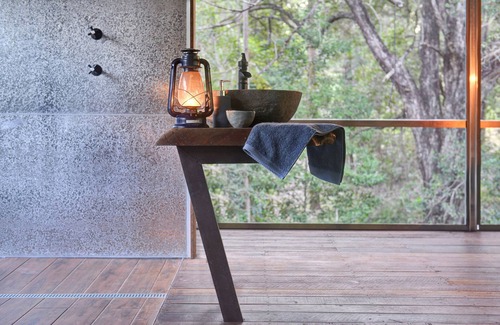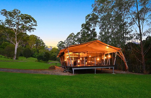 Sitting gently beside the tumbling waters of Petrie Creek, and touching the earth lightly… Starry Nights Luxury Camping is surrounded by wilderness with fresh, clean air. Starry Nights is nestled in the tranquil forests of the Sunshine Coast Hinterland and just over: 10 minutes to Montville and 20 minutes to Mooloolaba Beach. Each of our 75 sqm bespoke tents are set on the hillside with old recycled barn floorboards, hand carved stone basins and a cozy roaring wood fire. Each safari tent also has king sized beds with organic linen, flushing toilets and a hot steaming bath and shower. The beautiful guest lounge is a hub of laughter and new friendships. Your owners and hosts and allow only 2 bookings/groups at any one time ensuring your total privacy and a relaxing and peaceful retreat.