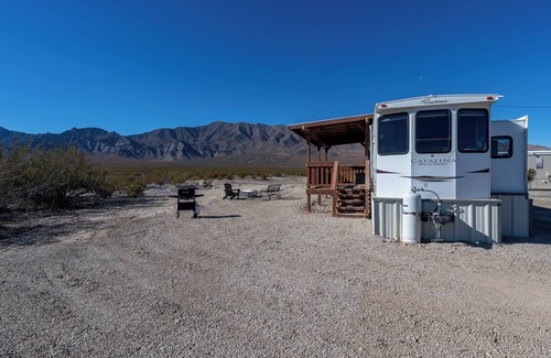 Reconnect with nature at this unforgettable escape. This one-of-a-kind, fully equipped Park Model RV offers a peaceful, remote getaway at the base of the Funeral Mountains. Unwind by the fire pit outside, enjoy a BBQ, play games, or simply relax on the covered deck. Inside, you'll find a full kitchen, cozy living room with a fireplace, a bathroom, and a king-size bedroom with two TVs for ultimate comfort and convenience. It’s the perfect place to unplug and recharge.
