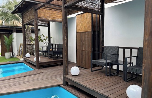 There is a pool wooden deck and gazebo in the courtyard where time passes slowly