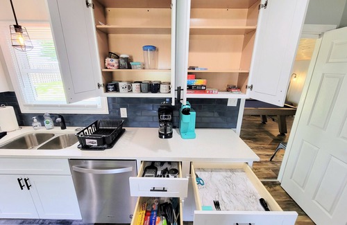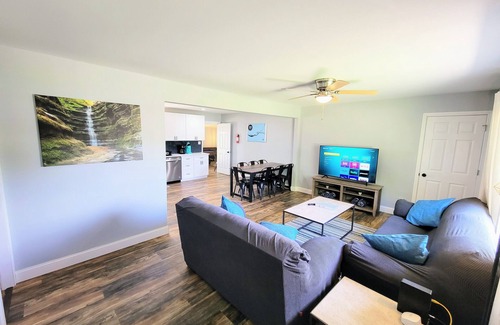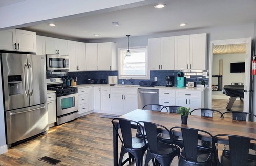 This ranch house is spacious providing and open concept floor plan and no steps in the home. It offers a full-sized kitchen, with everything needed to cook a family dinner. There is a beautifully remodeled master bathroom off of the master King bedroom, as well as a full bathroom shared between the two queen bedrooms and the dual twin bedroom. Each bedroom offers ample storage, and the master bedroom offers a dedicated workspace for traveling workers. In the living room we offer a full-sized pull-out couch with a 58-inch Roku TV and plenty of games for the kids in the kitchen Cupboard. Finally, the entertainment room boasts a full sleeper futon, an additional TV, a full-size pool table and a ping pong table topper. The entertainment room also has a washer and dryer.