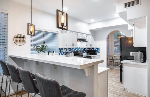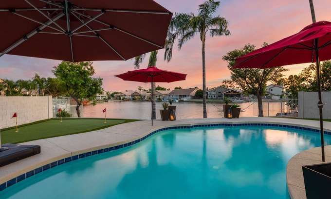 Relax and settle right into your vacation at our well appointed 4 bedroom, 3 bath home. Enjoy the sunsets from the gorgeous resort style heated pool, putting green and outdoor grill & dining! Two primary ensuite retreats each with King beds and two other Queen bedrooms with a shared bath, and enough space to comfortably sleep everyone. The kitchen is fully stocked and comfortable living areas to spread out. We're located near the major sporting venues and all the major Phoenix attractions.