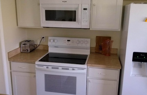 New modern appliances such as, refrigerator, stove, oven, microwave, dishwasher and coffee maker.