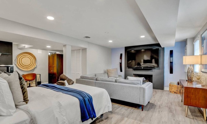 The open-concept layout offers a clean and welcoming space with everything you need for a comfortable stay. The sleeping area features a plush bed and a smart TV for winding down in the evenings. TV streaming services included are Hulu, Amazon, and YouTube TV. You’ll also have a dedicated workspace—ideal for working remotely or planning your DC itinerary.