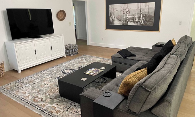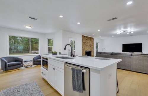 **Gourmet Kitchen**: Our fully equipped spacious kitchen includes a large island, featuring quartz countertops and all brand-new appliances, and is fully stocked for all your cooking needs.