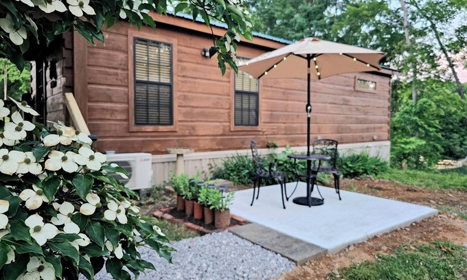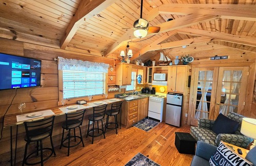From the moment you arrive, Dogwood Cabin wraps you in warmth and welcome. Its covered front porch, complete with cozy rocking chairs and a separate patio with bistro set with lighted umbrella, invites you to sip your morning coffee as the sunrise blankets the sky with unique hues and the lake mist lifts.