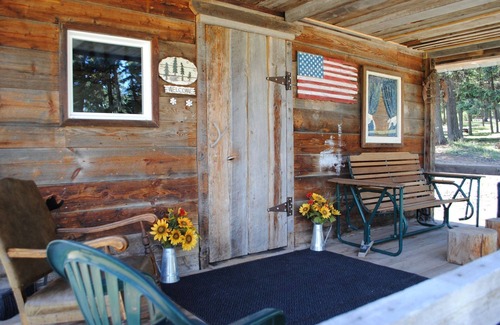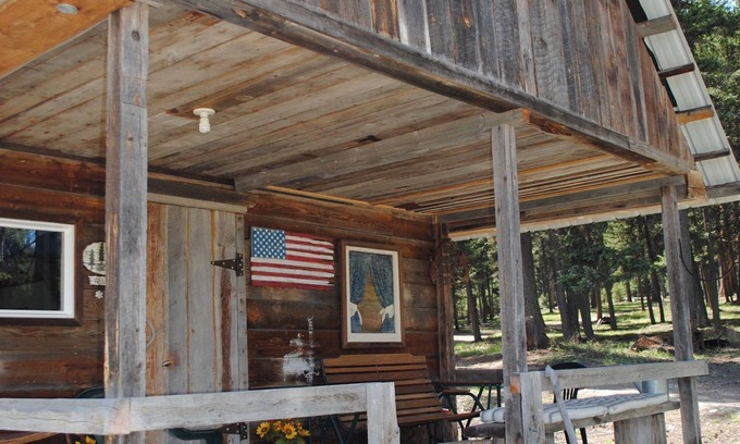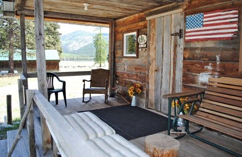We have the historic remodeled Ferguson Cabin with a loft bedroom that has a king sized bed on one end, two twin beds on the other. The main level has a full kitchen, dining area, living area, another twin bed, and a 3/4 bathroom (shower/no bath tub). The front porch looks out onto grassy meadows and wooded mountains of the McGinnis Meadows valley.