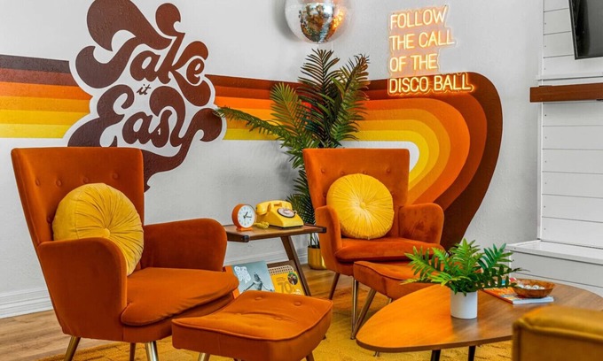 Bedroom 3 - This ground level bedroom has a 12" memory foam king mattress and disco fever art work.