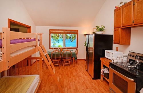 The living and sleeping areas are combined to occupy one side of the studio. Relax on the leather sofa, enjoy satellite channels, or complete rest in a king-sized bed. A trundle bed and bunk beds are also present for additional guests. Bonus: this whole side of the cottage can be partitioned off from the kitchen and dining area by closing the convenient pocket doors.