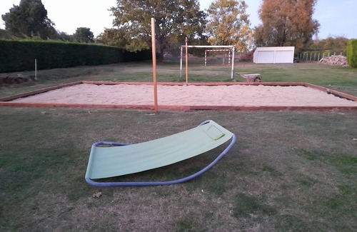 Outside: a large enclosed and private plot of land with a pétanque court, beach volleyball court, football pitch, trampoline.