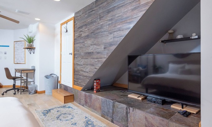 The suite includes a dining area, a dedicated work desk, high-speed Wi-Fi, and a smart TV with Roku and Chromecast for streaming your favorite content.