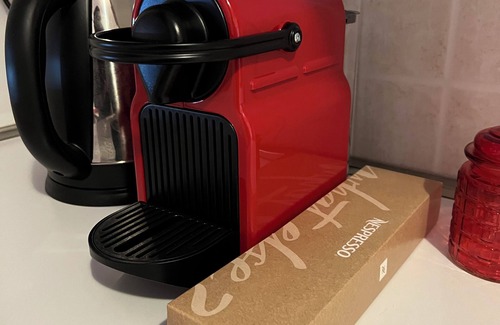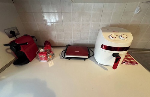 La cucina è attrezzata con tutto il necessario per preparare deliziosi pasti, inclusi macchina per il caffè Nespresso, friggitrice ad aria, bollitore, tostapane, frullatore a mano, pentole e molto altro.