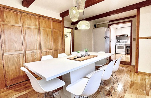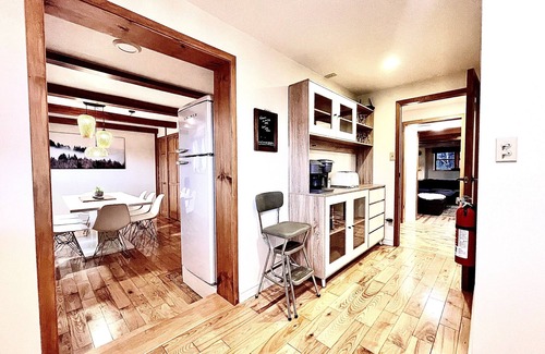 The home is newly updated and designed with a clean, modern cabin vibe that pulls nature in gently, while keeping comfort as the primary goal. The furniture, memory foam bedding and linens are all fresh and new. This 3 bedroom, 2 bath home has a fully equipped kitchen, living room and dining room that seats 8. The many windows and skylights bring the light and tranquil mountain views in.