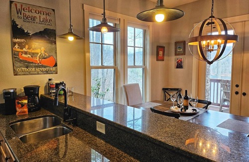 Located where the mountains touch the stars...... Yes we are new and ever so updated! Welcome to this well-appointed condo in Tuckasegee, overlooking the serene Bear Lake and a spectacular mountain view. This inviting property features two bedrooms—one with a king bed and another with a twin-over-full bunk bed—perfect for families or groups. Also an additional NEW queen sleep sofa in living room. With two bathrooms, including both a bathtub and a shower, guests will feel right at home. The fully equipped kitchen comes stocked with dishware, cookware, coffee mugs and wine glasses for sipping. The dining table comfortably seats 4–6, making it ideal for shared meals. Open the double doors to the balcony and enjoy the outside even when indoors while dining. Wireless internet is available and unwind with TVs in the living room and bedrooms, where you can stream your favorite content. Enjoy the scenery while you relax on the balcony overlooking the lake and mountains beyond.