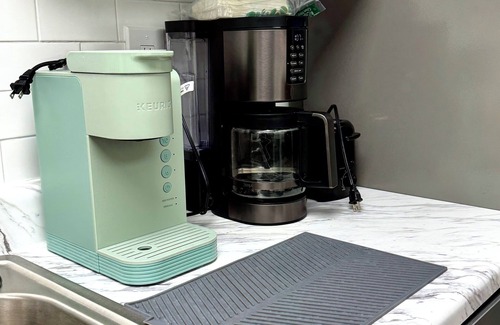 Washer and dryer with detergent provided. and dedicated work space available for your convenience.