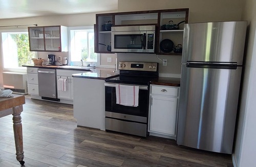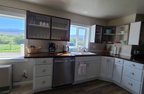 This is a unique opportunity to have your home away from home nestled right in the middle of our working family ranch. This stunning two bedroom, one bath home was built in the early 1900's and recently updated and styled for comfort, the real western experience, and offers some of the most spectacular views out of every window. The home is ready for artists, regenerative agriculture enthusiasts, families, fisherman, hunters, wanderers, and those of you with a gypsy soul. It is less than a ten minute drive to town but remote enough that you won't have any neighbors. It is totally set up to dine at the house, inside or outside on the gas grill. The den is set up with a library, games, and toys. Wireless internet will let you connect whenever you need to. The master bedroom features hand painted brands that are all regional family ranch brands. The bathroom rocks a long clawfoot tub to soak and relax or have a quick shower. Walk outside, look at the mountains, see the horses in the front yard or go for a walk on the ranch. We are a working ranch, there are times we will be moving cattle, putting up hay, training horses, and irrigating, tagging calves, sorting cattle, among other things. If that's not your jam, this isn't the place for you. If you're mildly curious about family ranches in the west that are working towards increased soil health, stewardship of all living things, and regenerative agriculture, then this is the place for you!