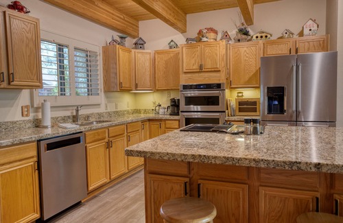 Sunset Timbers is over 2000 sf on a half-acre with 4 bedrooms, 2.5 baths, a loft and two outdoor sitting areas will fit your needs for just you and a special partner or the whole family. Modern furnishings, clean open spaces and high wood ceilings accent this amazing house. Rustic stone gas fireplace make the big room comfortable and a great place to look out the floor to ceiling front windows.