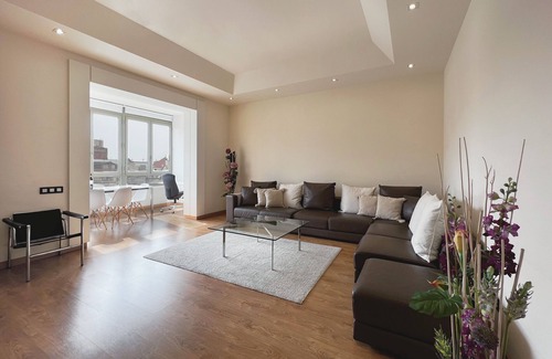 The living room has an understated décor, and is located in the center of the apartment, making it easy to move around the space.