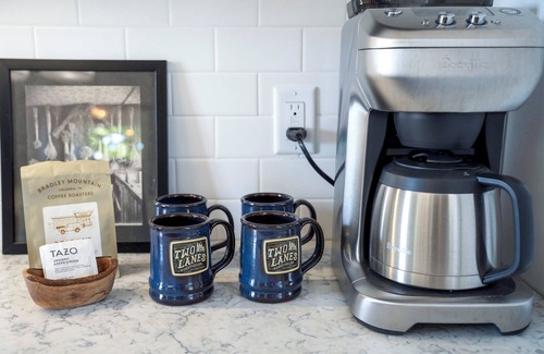Up the antique-lined staircase (yes, that’s a bicycle hanging above), where three bedrooms sleep up to eight adults in pure comfort. The primary bedroom features a king bed and its own sitting room with a queen pull-out sofa. Two more bedrooms - one with a queen, the other with antique twin beds draped in antique quilts offer space to rest your heads each night. Two bathrooms, stocked with bourbon-lavender soaps from Tennessee, add the final touch of thoughtful comfort.