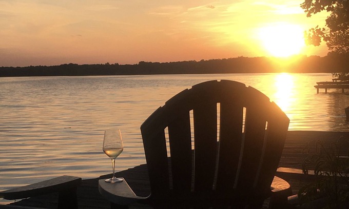 Stayawhile boasts over 1400 sq ft of beautifully decorated living space, including a spacious great room equipped with a 75" high-definition TV and surround sound—ideal for post-wedding relaxation or entertainment. The open-concept kitchen features top-of-the-line appliances, including an induction cooktop and Le Creuset cookware, making it convenient for catering your wedding festivities. The main bedroom offers a sumptuous king-size bed with a pillow-top mattress, while two additional bedrooms provide further comfortable accommodations, ensuring a restful stay for everyone involved in your special day. Step out onto the expansive deck, adorned with rocking chairs and outdoor seating, where you can enjoy stunning lakeside views and magical sunsets that provide a romantic ambiance for cherished moments with your loved ones.