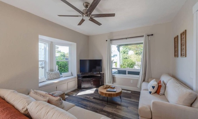 When you enter the home from the exterior porch you will arrive to a comfortable outdoor glider. The trees and picket fence create a quaint space perfect for your morning coffee or a glass of wine enjoying the nicely landscaped front yard. The living area is cozy with natural light and set up with comfortable seating and a Flat screen Smart TV with Roku internet streaming. Relax and enjoy an evening catching up on your favorite episodes or reading a book in the sunny window seat.