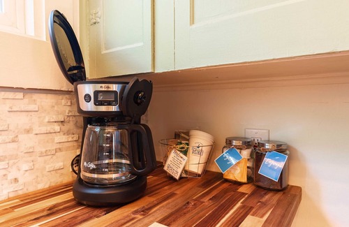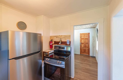 Eating in is simple with the efficient & compact kitchen, complete with plenty of utensils, cookware, and dishes. Full size stainless appliances for preparing larger meals. Kitchen is stocked and includes a microwave, coffee maker and small appliances for your convenience. (NO Dishwasher). There is a 4 person dining table in the adjacent porch/dining area.