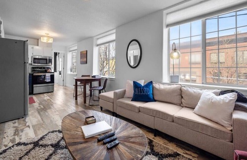 #StayinMyDistrict Downtown Vancouver. City slickers, listen up! Ready to immerse yourself in “The Couve's” vibrant downtown scene? Modern Updated 2nd-level apartment (Yes, you'll need to climb stairs!) on a bustling city corner, above retail. Just outside your door you can walk to bars, restaurants, shops, coffee, and music and transit! The building is secure & shared w/long-term tenants. 1 Queen bed/1 bath home, full-kitchen, bright/open to dining & living room. MUST Pay to Park 7/days week.