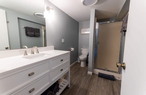 The basement 2nd bathroom features an updated vanity and fresh paint, along with a shower. Fully stocked with quality linens, Shampoo, Conditioner, and hairdryer are also provided for your convenience.
