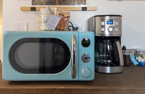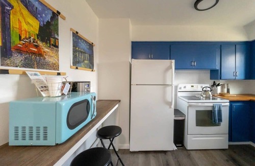 Fully stocked kitchen makes cooking from home convenient and efficient. Updated with full size appliances including refrigerator, stove, oven, microwave, & coffee maker. Plenty of utensils and cookware make eating in simple. Complete with a dining table with seating for (4) & (2) additional bar stools in the kitchen.