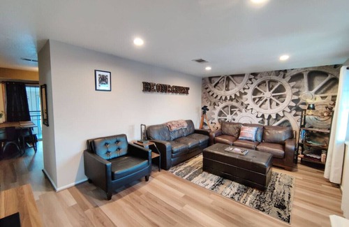 Welcome to your dream Steampunk themed getaway! 1 King, 2 Queens, where Victorian elegance intertwines with industrial chic, creating an enchanting atmosphere perfect for your wedding celebration. Nestled in a cozy suburb of Denver, this unique three-bedroom home provides you and your guests with an unforgettable experience. Imagine hosting your pre-wedding events or intimate gatherings in this stunning sanctuary, where every corner tells a story and inspires romance.