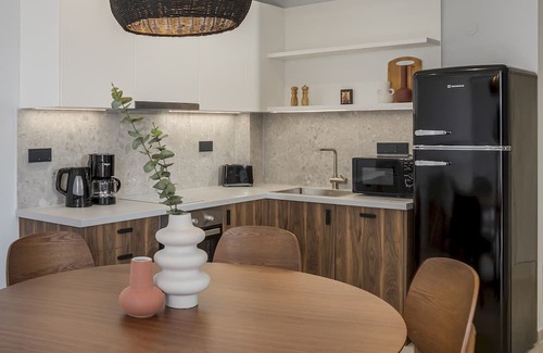 The open plan area features a fully equipped kitchen with a dining table and a modern living room. The kitchen is equipped with all the essentials needed for a self-catered vacation.