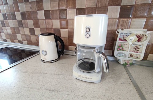The kitchen is fully equipped with all the electric devices and cooking utensils. There is refrigerator , oven , electric cooking hobs , microwave , toaster , coffee machine , blender , kettle , dishes , water glasses , cups, and all the cooking utensils.