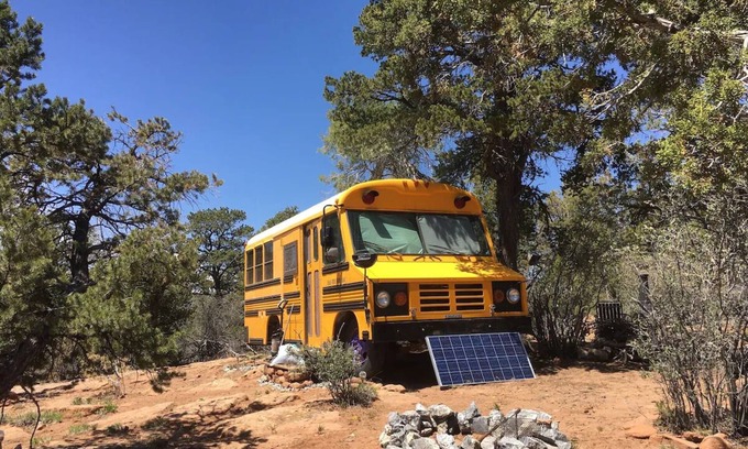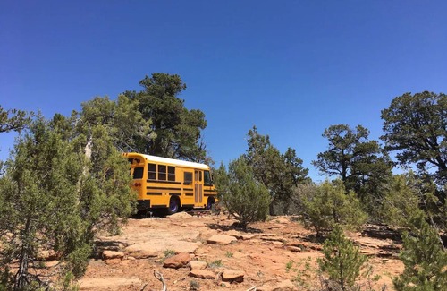 Enjoy the views from the Hilltop School Bus, camp in a secluded area a short walk to the community area. All the basics including water, limited solar power, lights and a private campfire pit, fire wood available on site at no cost. There is room to set up a tent in front of your unit.