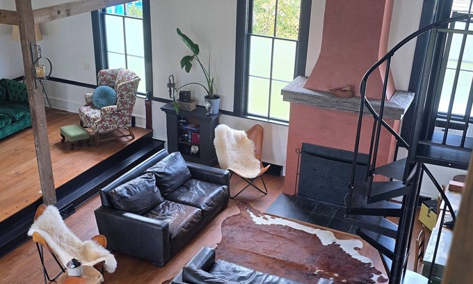 1 loft accessible by a fun circular staircase, which offers 2 super comfy queen size beds and offers a fun view of the Sanctuary.