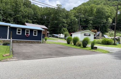 Navy blue house with fenced in front yard, front porch, gas grill, fire pit & landscaped yard! Great room with sectional sofa and leather recliners. Fully stock kitchen. All linens and towels with washer and dryer. Large paved driveway. 10 minutes to Rockhouse Trail Head 5.6 miles no need to trailer your sxs