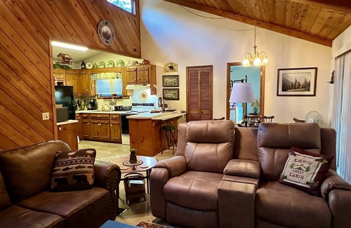 A Large secluded screened porch awaits you, with rockers, a dining table, and mountain sunset views through the trees. If you enjoy reading or just want to get away to mountain serenity & your own special music, our private screened porch nestled in the forest — comfortable rockers included---should be one of the most enjoyable features of our Cabin. We have 2 flat-screen smart TVs for enjoying Netflix, YouTube live TV and a wide variety of other shows. There is an activity closet with movies, books, cards, puzzles and board games. Current magazines are also available as well as hiking and guide books for the area. You will find a Gas grill on the deck, complete with utensils. While grilling, relax in the rockers and enjoy the lush forest view; soaking in the fresh air, bird song, and pine ladened breezes. The fire pit on the deck adds to your relaxing experience. Enjoy seasonal mountain views for much of the year as well; see our many pictures!