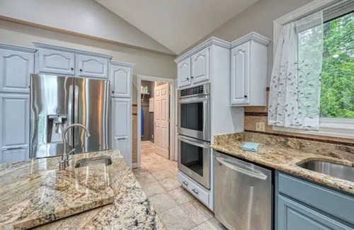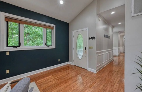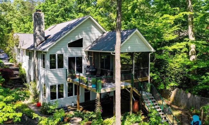 Nestled in the woods, Stepping Stone Cove is your family's perfect spot for scenic views, swimming, fishing, and boating. Located in a quiet cove, this gorgeous home features an open concept living space, 2 fireplaces, 4 bedrooms, 2.5 bathrooms, rec room, and office. Outside, you'll find a screened-in porch, deck, and patio with hammocks and hot tub with lake views for ultimate relaxation. Head out the back door to your own private dock and lake access! Central AC, wifi, and pet-friendly, 9 min drive to downtown & grocery!