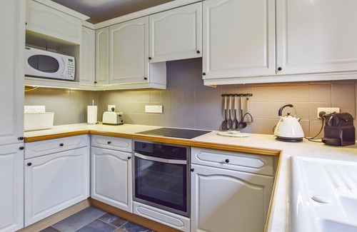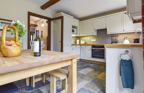 Leading through from the living room to the rear of the cottage is a very well-equipped kitchen-diner, benefitting from sweeping views of the cottage's beautiful rear garden. Decorated in a classic farmhouse style, with sleek grey tiles and a slate tile floor, in here you'll find all you need for a self-catered stay, including an oven and induction hob, dishwasher, microwave, built-in fridge/freezer, washing machine and plenty of bakeware, crockery and glassware for guests' use. An attractive oak dining table and seating offer the perfect place to enjoy a feast, sat alongside the French doors, which open directly on to the patio (with two bistro tables and 4 chairs) and the garden, perfect for enjoying a sunrise or sunset.