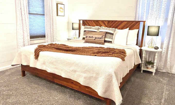 Our restored 1937 duplex is ideally located within walking distance of the BEST restaurants and just two blocks from The Square. Savor a glass of local wine on the patio while live music floats in the air and passersby declare, "You are on the BEST patio in downtown!" Experience the charm of original wood plank walls, a convenient vanity/desk in the main bedroom, and an additional TV in the second bedroom. The cozy living area features a convertible queen sleeper sofa, a smart TV w/cable, and other streaming apps. Set out on a walking tour to discover craft breweries, wine tasting, shopping, and much more, all within a 3 block radius. As evening falls, enjoy an easy stroll to a romantic dinner or a cocktail at one of the many local hot-spots. Relax on the private back patio, complete with a fire pit and party lights. The home features HVAC, a fully equipped kitchen, WiFi, and laundry. This property is perfect for couples or friends getaways with pricing based on (2) guests. Accommodations for up to four guests for an additional fee. The Porch on Pine, where you park the car and indulge in endless downtown fun.