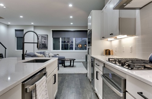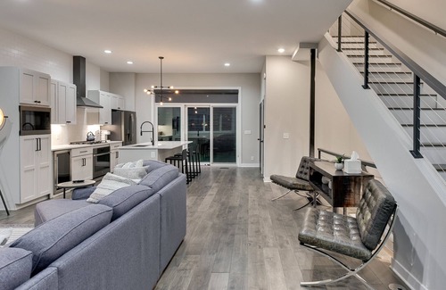 Market's Edge is a 4-level urban, townhouse with a beautiful open-concept kitchen & living space opening up to a quiet and cozy backyard. Enjoy two bedrooms appointed with high-end furnishings and linens as well as en suite bathrooms with bidet toilets. The primary bedroom has an inviting king bed and a walk-in closet. The second bedroom has a sturdy, Restoration Hardware "Full over Queen" bunk bed to help accommodate extra guests. Our favorite space is the rooftop terrace with an outdoor sectional couch and firepit overlooking beautiful views of downtown Omaha.