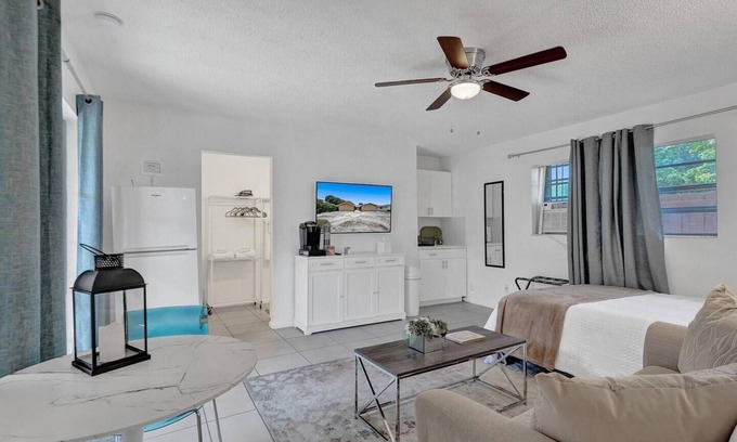 Walk 1 block to the famous Hardrock Guitar which hosts a beautiful casino, concerts, fine dining restaurants, rooftop bars, and more! Our studio apartment has been comfortably furnished and decorated by a professional designer. We have lush & new furnishings, a smart TV, a full-sized refrigerator, a kitchenette, coffee, fast free wifi, and 1 free parking space.